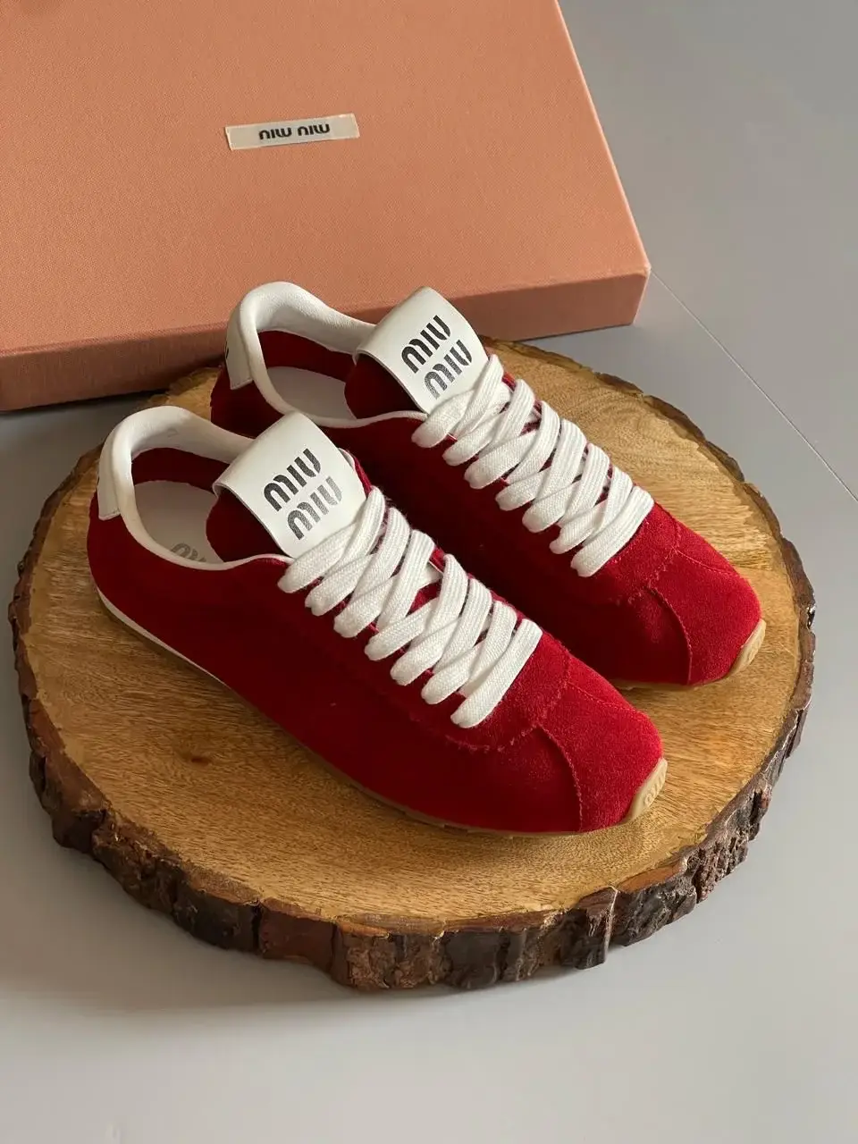 Crafted from the finest, butter-soft suede in a vibrant, head-turning Scarlet Plume hue, these sneakers command attention. The iconic MIU MIU platform sole provides a confident elevation and unparalleled comfort, while the exaggerated, sculpted tongue—a signature of the house—adds a playful, deconstructed edge. Meticulous details, from the precise stitching to the debossed logo, attest to their superior master quality.