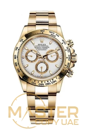 Rolex Daytona 116508 dazzles with an 18k yellow gold case, white dial, and precise chronograph functions—luxury and performance in one iconic timepiece.